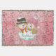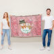 Pretty Christmas holiday throw blanket with a vintage pink background with little snowmen and snowflakes and a pink and white polka dotted circle with a snowman and snow lady dressed in top hats and winter hat and scarves with text that reads Let it Snow!