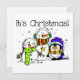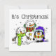 A cute holiday design featuring two snowmen and a penguin dressed in scarves, winter hats, and earmuffs and text that reads It's Christmas on holiday T-shirts, sweatshirts, mugs, bags, cards, stickers, keepsakes, pillows, and much more!