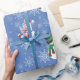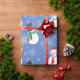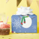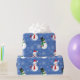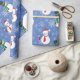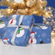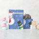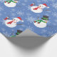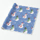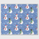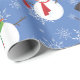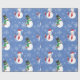 A pattern with two different snowmen, one with a red scarf and hat and one with a green scarf and black top hat, and snowflakes decorating the background of medium blue.