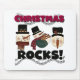 Christmas rocks! Three cheery holiday snowmen in stovepipe hats and winter scarves, musical notes, and black and red text that reads "Christmas Rocks!" is featured on holiday snowman greeting cards, T-shirts, sweatshirts, mugs, and other holiday apparel and gift items.