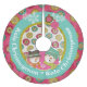 Say Merry Christmas like they do in Greece with this colourful, fun holiday tree skirt featuring snowflake orbs on hot pink, a row of aqua blue, snowflake orbs on white, a snowman couple wearing hats, scarves, and carrot noses, a few white snowflakes, and white text that reads Kala Christouyenna!