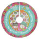 Say Merry Christmas in Italian with this colourful, fun holiday tree skirt featuring snowflake orbs on hot pink, a row of aqua blue, snowflake orbs on white, a snowman couple wearing hats, scarves, and carrot noses, a few white snowflakes, and white text that reads Buone Feste Natalizie!