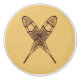 A crossed pair of snowshoes superimposed on a buckskin background. There are several different styles of traditional snowshoes. Those pictured here are made of Ash and moosehide babiche (webbing) in the Alaskan pattern. Longer and thinner than some other styles, such as the bearpaw, Alaskan snowshoes allow for a more natural gate and are well suited for cross-country travel. The slightly upturned tips allow you to drag your feet a bit. Be advised snowshoes can make for excellent skies; generally at the worst possible moment.