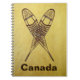 A crossed pair of snowshoes on a braintan leather background. Customisable text reading "Canada" also appears. There are several different styles of traditional snowshoes. Those pictured here are made of Ash and moosehide babiche (webbing) in the Alaskan pattern. Longer and thinner than some other styles, such as the bearpaw, Alaskan snowshoes allow for a more natural gate and are well suited for cross-country travel. The slightly upturned tips allow you to drag your feet a bit. Be advised snowshoes can make for excellent skies; generally at the worst possible moment.