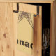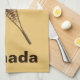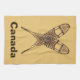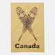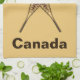 A crossed pair of snowshoes on a background colour suggesting braintan leather. Customisable text reading "Canada" also appears. There are several different styles of traditional snowshoes. Those pictured here are made of Ash and moosehide babiche (webbing) in the Alaskan pattern. Longer and thinner than some other styles, such as the bearpaw, Alaskan snowshoes allow for a more natural gate and are well suited for cross-country travel. The slightly upturned tips allow you to drag your feet a bit. Be advised snowshoes can make for excellent skies; generally at the worst possible moment.