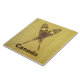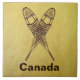 A crossed pair of snowshoes on a braintan leather background. Customisable text reading "Canada" also appears. There are several different styles of traditional snowshoes. Those pictured here are made of Ash and moosehide babiche (webbing) in the Alaskan pattern. Longer and thinner than some other styles, such as the bearpaw, Alaskan snowshoes allow for a more natural gate and are well suited for cross-country travel. The slightly upturned tips allow you to drag your feet a bit. Be advised snowshoes can make for excellent skies; generally at the worst possible moment.