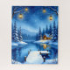 A serene winter night scene featuring a cosy log cabin glowing with warm light, nestled among snow-covered pine trees. A wooden dock extends over a still, icy lake reflecting the beauty of the starry sky above. Hanging lanterns softly illuminate the scene, creating a magical and tranquil holiday atmosphere. Perfect for winter lovers, cosy cabin vibes, and peaceful seasonal decor.