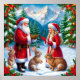 A delightful Christmas-themed illustration of Santa Claus, a young child, and a rabbit amidst a snowy, festive background adorned with gifts and decorations.