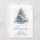 A snowy decorated Christmas tree accents these holiday party invitations with your details in chic lettering.