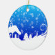 A blue and white wintry design with snowflakes in the sky, snow covered house and pines and swirling snow to the right.