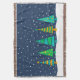 A modern geometric design of five fir trees in green, turquoise and golden yellow. The sky is navy with white falling snow.