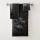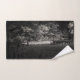 A black and white towel collection featuring a peaceful winter landscape design.