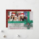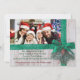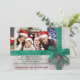 An attractive and eye catching Christmas card with your family photo highlighted by snowy Christmas green ribbon with your Christmas message and names below. Backside features a repeating pattern of the gold Merry Christmas against a dark red.