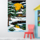 A tranquil winter scene of a traditional wooden cottage nestled in snow, with a reflective lake, towering pines, and a bright sunset sky.