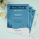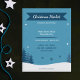 A charming Christmas Market Flyer in blue tones featuring a snowy landscape and its fir trees, some snowflakes and stars. Simply customise texts and use it for your local Xmas events. You can also use it as party invitation or dinner!