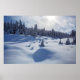 This photo features a simple landscape with deep drifts of snow, deep shadows, and snow laden trees.