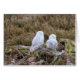 Original photo of a pair of snowy owls sitting on a driftwood log by the beach surrounded by dried grass and flowers.