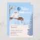 This charming Winter ONEderland birthday invitation features a beautiful Snowy Owl holding a delicate snowflake balloon while perched beside a rich chocolate birthday cake. In the background, a sweet Barn Owl peeks out from a snowy winter scene, adding a sense of woodland charm and seasonal magic—perfect for celebrating a little one’s first birthday in cozy winter style.