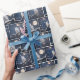 Snowy owls on tree branches and snowflakes with full moon on blue night sky