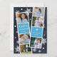 Cute Hanukkah photo card features two photo booth strips, each with three photos and a blue text panel, for a total of six photos. Personalise with the year and your family name or names in whimsical, festive white lettering, on a navy blue background dotted with hand white snowflakes and white stars of David.