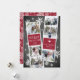Cute holiday photo card features two photo booth strips, each with three photos and a cranberry red text panel, for a total of six photos. Personalize with the year and your family name or names in whimsical, festive white lettering, on a rustic chalkboard background dotted with hand drawn white snowflakes.