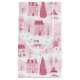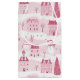 A cute pink Christmas village with a snowy white background, dotted with smiling snowmen, bright pink trees, and adorable houses.