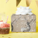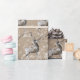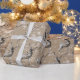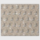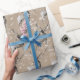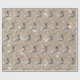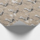 White winter snowy owl surrounded by snow on Kraft paper gift wrap.