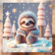 The image features an adorable cartoon sloth sitting contentedly on a snowy surface. The sloth has large, expressive eyes and a gentle smile. Its fur is a soft brown, dusted with what appears to be snow, giving it a cosy, wintery appearance. The sloth is positioned in front of three stylised Christmas trees in a soft pink hue. The background is a muted purple, adorned with sparkling gold stars and dots, creating a festive and magical atmosphere. Small, golden baubles are scattered around the sloth, adding to the overall charm of the scene.