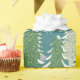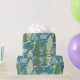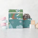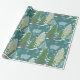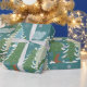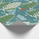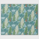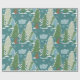 Pretty holiday or winter wrapping paper features evergreen trees, some covered with snow, snowflakes, clouds, little red foxes, and blue sky!
