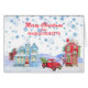 Send a bit of Massachusetts to your friends and family this Holiday Season, with this cute watercolor design of a whimsical snowy mountain village. Included in the image are colourful houses, a snowman, and a red pickup truck with a Christmas tree in the back. Icy blue snowflakes fall down from the sky. The text in red at the top can be changed to anything you'd like, as can the text on the inside. *Image design credit to EphrazyDesign.