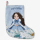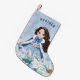 This adorable snowy winter Princess stocking features a beautiful young princess with black hair wearing a blue and white snowflake gown and warm fur lined cape. The princess is surrounded by poinsettias. You can personalise with your princess's name!