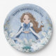This adorable snowy winter Princess paper plate features a beautiful young princess with brown hair wearing a blue and white snowflake gown and warm fur lined cape. The princess is surrounded by poinsettias. You can personalise with the special birthday princess's name!