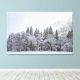 The image captures a serene winter landscape featuring a snow-covered forest. Various trees, including evergreens and deciduous types, are heavily laden with snow, creating a white and grey colour palette. In the background, a large mountain is partially obscured by mist or clouds, adding depth to the scene. The ground is also covered in a thick layer of snow.