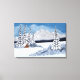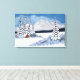 A canvas print with a beautiful winter scene including snowy mountains, rustic cabin and snow covered evergreens. Original artwork by W.B.