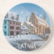 Panoramic view of St. Peter's Church and surrounded historical buildings in winter in old town in Riga, Latvia.