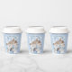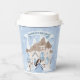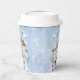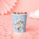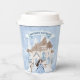 This adorable snowy winter Princess paper cup features a snow castle and beautiful young princess with black hair wearing a blue and white snowflake gown and warm fur lined cape. The princess is surrounded by poinsettias. You can personalise with the special birthday princess's name!