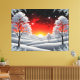 A breathtaking winter scene featuring frosted trees, soft snow, and a glowing red sunset beneath a star-filled sky, evoking calm, wonder, and natural beauty.