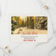 Christmas party save the date card with a beautiful nature photograph. An isolated winter path with tall snow covered pine trees lining the trail. A golden twilight hue creates a magical feel to this photo.