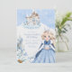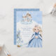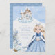 This adorable snowy winter Princess Tea Party invitation features a beautiful young princess with blonde hair wearing a blue and white snowflake gown and warm fur lined cape. The princess is holding a tea cup with a blue snowflake on the front. In the distance is a snow-capped castle with a banner that says "join us for a Princess Tea." You can personalise with all the special details of your party!