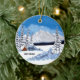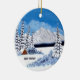 A holiday ornament with a beautiful winter scene including snow covered mountains, evergreens and rustic cabin. The images and text can be customised, replaced or deleted. Original artwork by W.B.