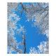 A snowy winter scene looking up through the trees that are covered with snow against a bright blue sky.