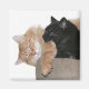 An orange tabby long haired cat and a black cat snuggle up together in their cat tree cause it's cold outside photo magnet