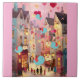 A charming evening scene in a quaint village courtyard with vibrant balloons and birds carrying love letters. Warm lights illuminate the street as people gather under festive decorations.