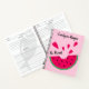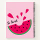This pretty pink notebook is designed to hold your recipes. It is decorated with a single image of a bright, juicy red watermelon slice with a bite, and a pattern of hearts splashing out. The background is pale pink and can be personalised with your words and name. The back of the notebook also has the watermelon design.
