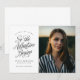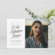 "So the Adventure Begins" script minimalist black and white photo graduation announcement. Personalised with your grad year, name, school name, and photo. © Kimbellished, LLC