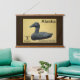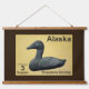 A postage stamp from a mythical independant Alaska featuring a soapstone carving of an Eider Duck. The background is brain tanned moose hide. This is a digital rendering, not an actual soapstone object. The Common Eider, Somateria mollissima, is the largest duck found in Europe and in North America (except for the Muscovy Duck which only reaches North America in a wild state in southernmost Texas) The Eider is distributed over the northern coasts of Europe, North America and eastern Siberia. It breeds in Arctic and some northern temperate regions, but winters somewhat farther south in temperate zones, when it can form large flocks on coastal waters. It can fly at speeds up to 70 mph (113 km). The Eider is chraacterised by its bulky shape and large, wedge-shaped bill. The male is unmistakable, with its black and white plumage and green nape. The female is a brown bird, but can still be readily distinguished from all ducks, except other eider species, on the basis of size and head shape. This duck's call is a pleasant "ah-ooo." The species is often readily approachable. Drakes of the European, eastern North American and Asia/western North American races can be distinguished by minor differences in plumage and bill colour. This species dives for crustaceans and molluscs, with mussels being a favored food. The Eider will eat mussels by swallowing them whole; the shells are then crushed in their stomachs and excreted. When eating a crab the Eider will remove all of its claws and legs and then eat the body in a similar fashion. It is abundant, with populations of about 1.5-2 million birds in both North America and Europe, and also large but unknown numbers in eastern Siberia. A particularly famous colony of eiders lives on the Farne Islands in Northumberland, England. These birds were the subject of one of the first ever bird protection laws, established by Saint Cuthbert in the year 676. About 1,000 pairs still nest there every year. Because St. Cuthbert is the patron saint of Northumberland, it was natural that the eider should be chosen as the county's emblem bird; the birds are still often called Cuddy's ducks in the area, "Cuddy" being the familiar form of "Cuthbert". The Common Eider is one of the species to which the Agreement on the Conservation of African-Eurasian Migratory Waterbirds (AEWA) applies. Eiders are colonial breeders. They nest on coastal islands in colonies ranging in size of less than 100 to upwards of 10,000-15,000 individuals. Female eiders frequently exhibit a high degree of natal philopatry, where they return to breed on the same island where they were hatched. This can lead to a high degree of relatedness between individuals nesting on the same island, as well as the development of kin-based female social structures. This relatedness has likely played a role in the evolution of co-operative breeding behaviours amongst eiders. Examples of these behaviours include laying eggs in the nests of related individuals and crèching, where female eiders team up and share the work of rearing ducklings. The eider's nest is built close to the sea and is lined with the celebrated eiderdown, plucked from the female's breast. This soft and warm lining has long been harvested for filling pillows and quilts, but in more recent years has been largely replaced by down from domestic farm-geese and synthetic alternatives. Although eiderdown pillows or quilts are now a rarity, eiderdown harvesting continues and is sustainable, as it can be done after the ducklings leave the nest with no harm to the birds.
