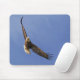 An adult bald eagle in a sharp turn highlighted by a blue sky.
