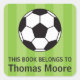 Personalised bookplates for kids featuring a baseball on a green, striped soccer field background. Customisable text "This book belongs to [Name Surname]". These soccer ball book labels are perfect for a little boy or girl who loves this sport.