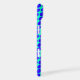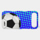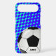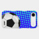 Custom soccer fan iPhone 4 case, with graphics of a blue and aqua dot pattern background. Graphics of a soccer ball decorates the bottom right corner of the case and custom black text, on the bottom, is ready to personalise. Great phone case for the sports fan or soccer player.