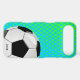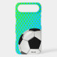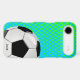 Custom soccer fan iPhone 6 case, with graphics of a blue and green dot pattern background. Graphics of a soccer ball decorates the bottom right corner of the case and custom black text, on the bottom, is ready to personalise. Great phone case for the sports fan or soccer player.